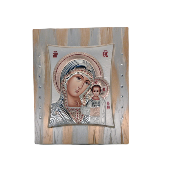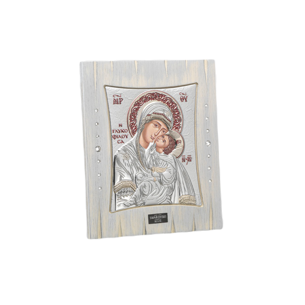 Χειροποίητη Ασημένια Eικόνα της Παναγίας, πάνω σε ξύλο, στολισμένη με κρύσταλλα SWAROVSKI. Διάσταση 17Χ14 εκ.