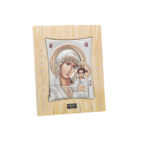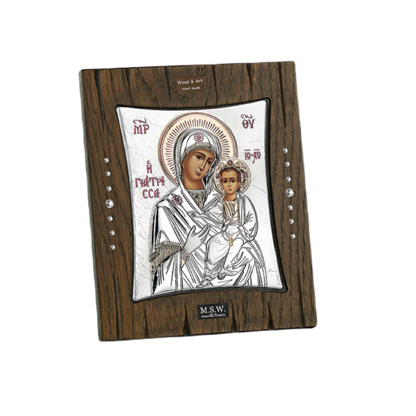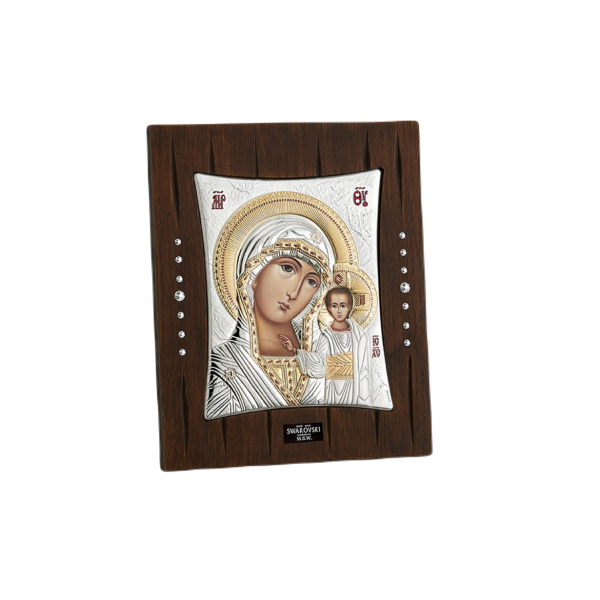 Χειροποίητη Ασημένια Eικόνα της Παναγίας, πάνω σε ξύλο, στολισμένη με κρύσταλλα SWAROVSKI. Διάσταση 23Χ19 εκ.
