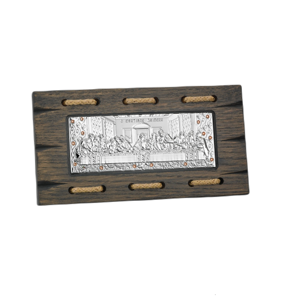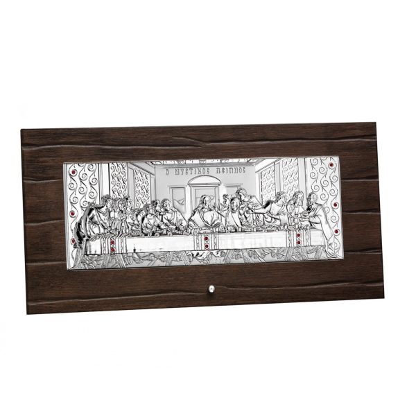 Χειροποίητη Ασημένια Eικόνα του Μυστικού Δείπνου, πάνω σε ξύλο, στολισμένη με κρύσταλλα SWAROVSKI. Διάσταση 25Χ13 εκ.