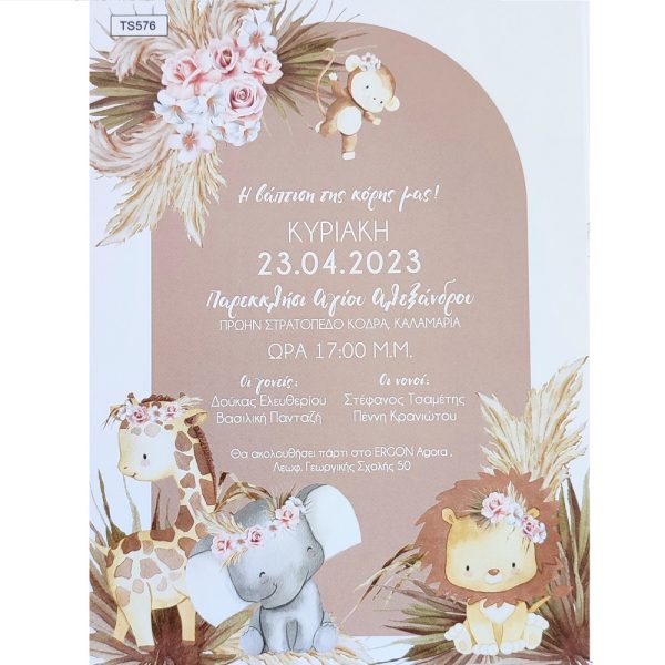 Προσκλητήριο βάπτισης για κορίτσι με θέμα ζωάκια της ζούγκλας, σε χαρτί Bristol Λευκό 250gr σε διάσταση 19,5×14,5 cm.