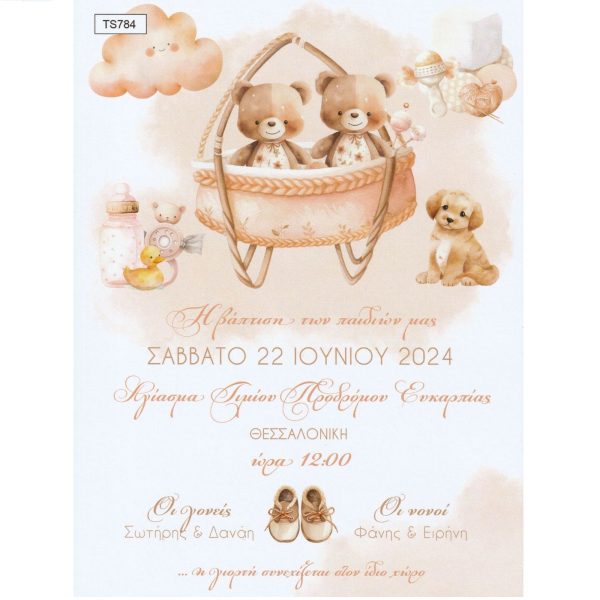 Προσκλητήριο βάπτισης για δίδυμα με θέμα αρκουδάκια