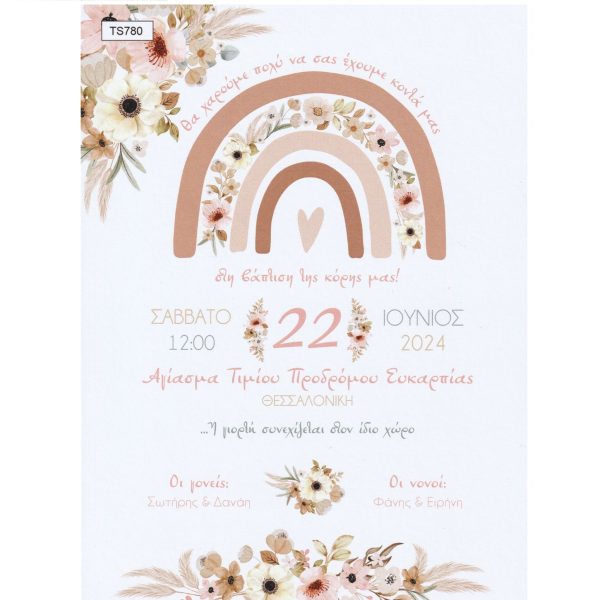 Προσκλητήριο βάπτισης με θέμα Ουράνιο τόξο και λουλούδια, σε χαρτί Bristol Λευκό 250gr σε διάσταση 19,5×14,5 cm.