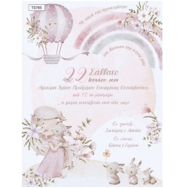Προσκλητήριο βάπτισης με θέμα Dusty Pink Fairytale, σε χαρτί Bristol Λευκό 250gr σε διάσταση 19,5×14,5 cm.