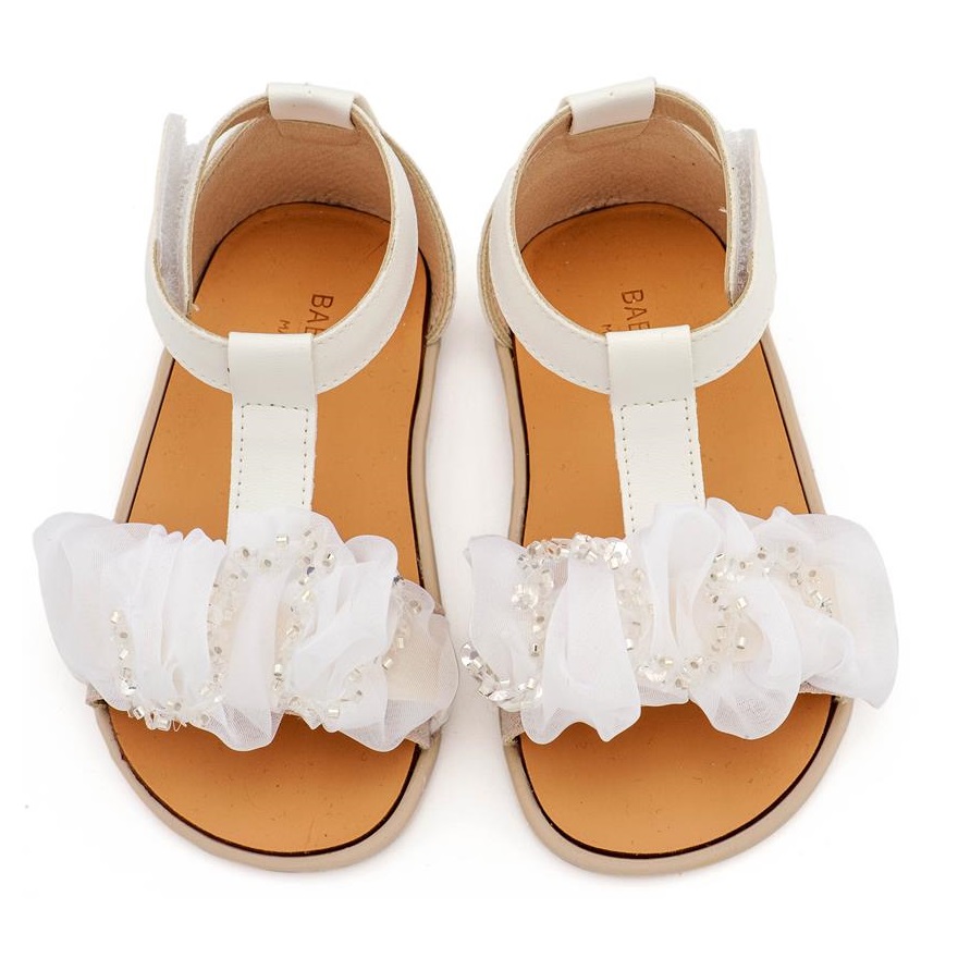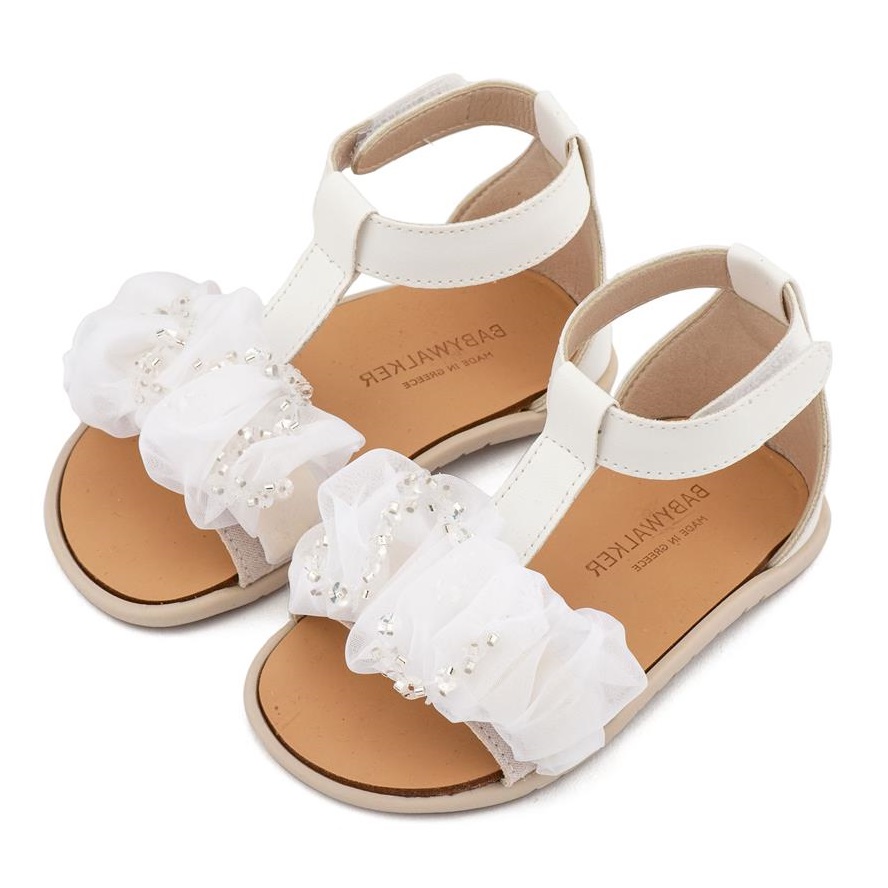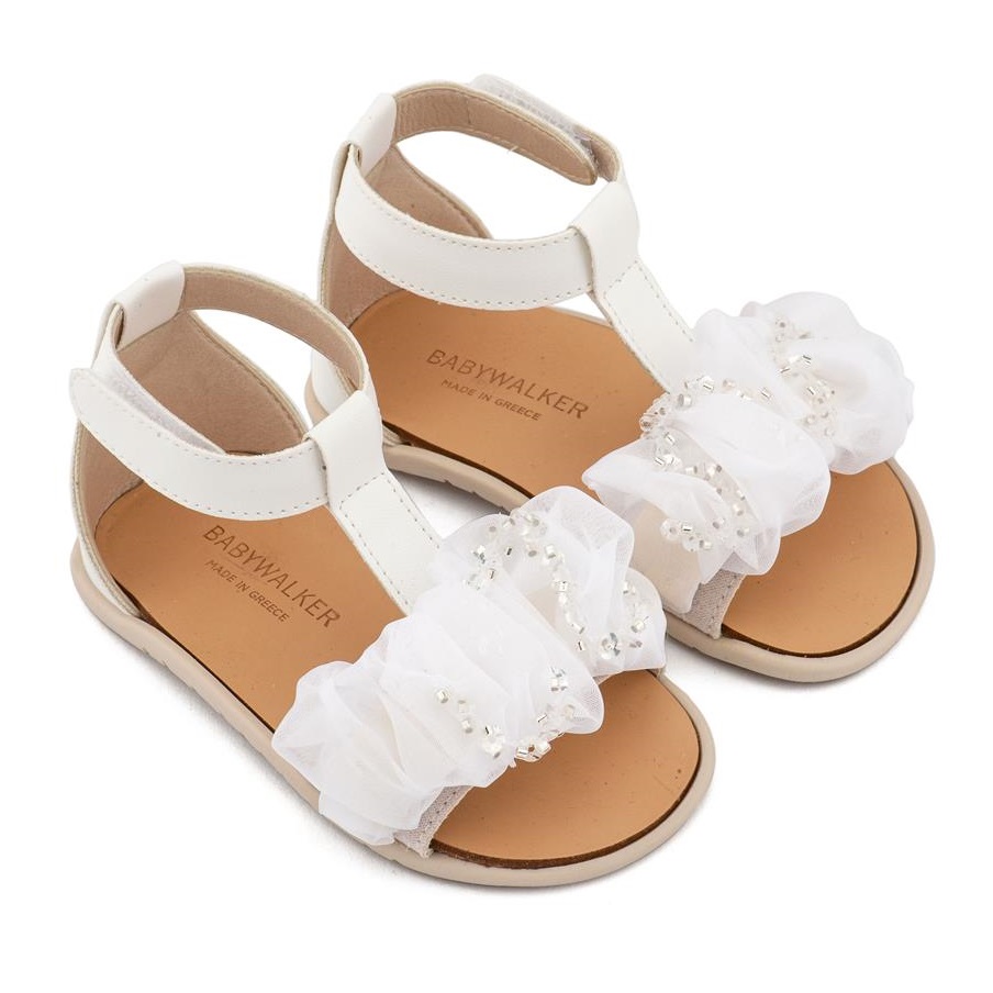 Δερμάτινο Πέδιλο Διακοσμημένο με Χειροποίητο Διακοσμητικό Οργάντζας και Παγιέττες σε Λευκό Χρώμα της εταιρίας Babywalker