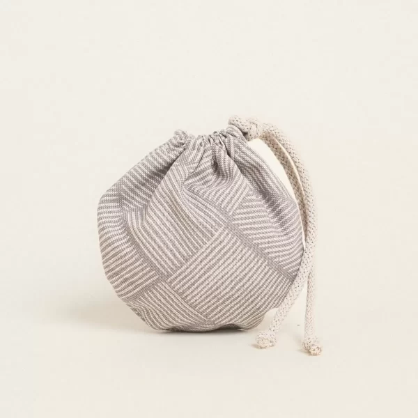 Μπομπονιέρα πουγκί οβάλ με κορδόνι, διαστάσεων 13 x 14 cm, συνδυασμένο με το σετ βάπτισης διαγώνιες γραμμές μπεζ.