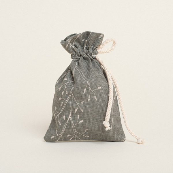 Μπομπονιέρα πουγκί, διαστάσεων 12 x 17 cm, συνδυασμένο με το σετ βάπτισης κλαδιά σε λαδί φόντο.