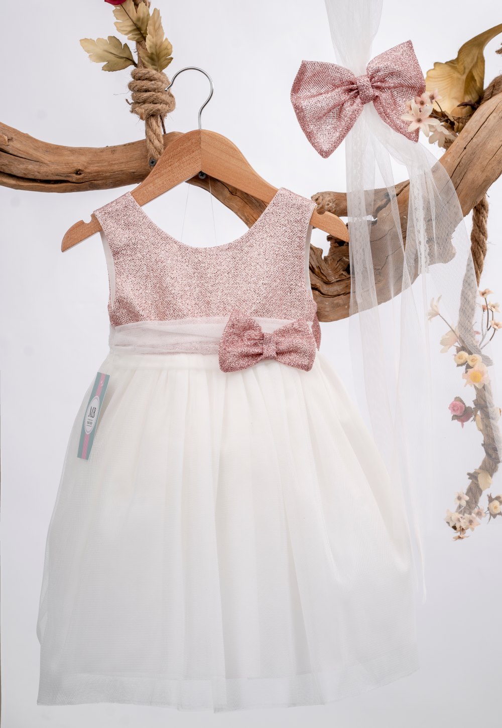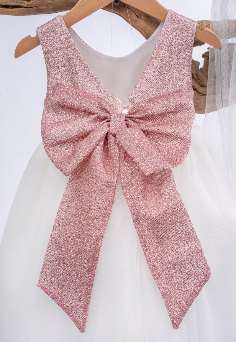 Βαπτιστικό φόρεμα ελληνικής κατασκευής της εταιρίας Mak baby από ιβουάρ τούλι με glitter στο πάνω μέρος και μεγάλο φιόγκο πίσω.