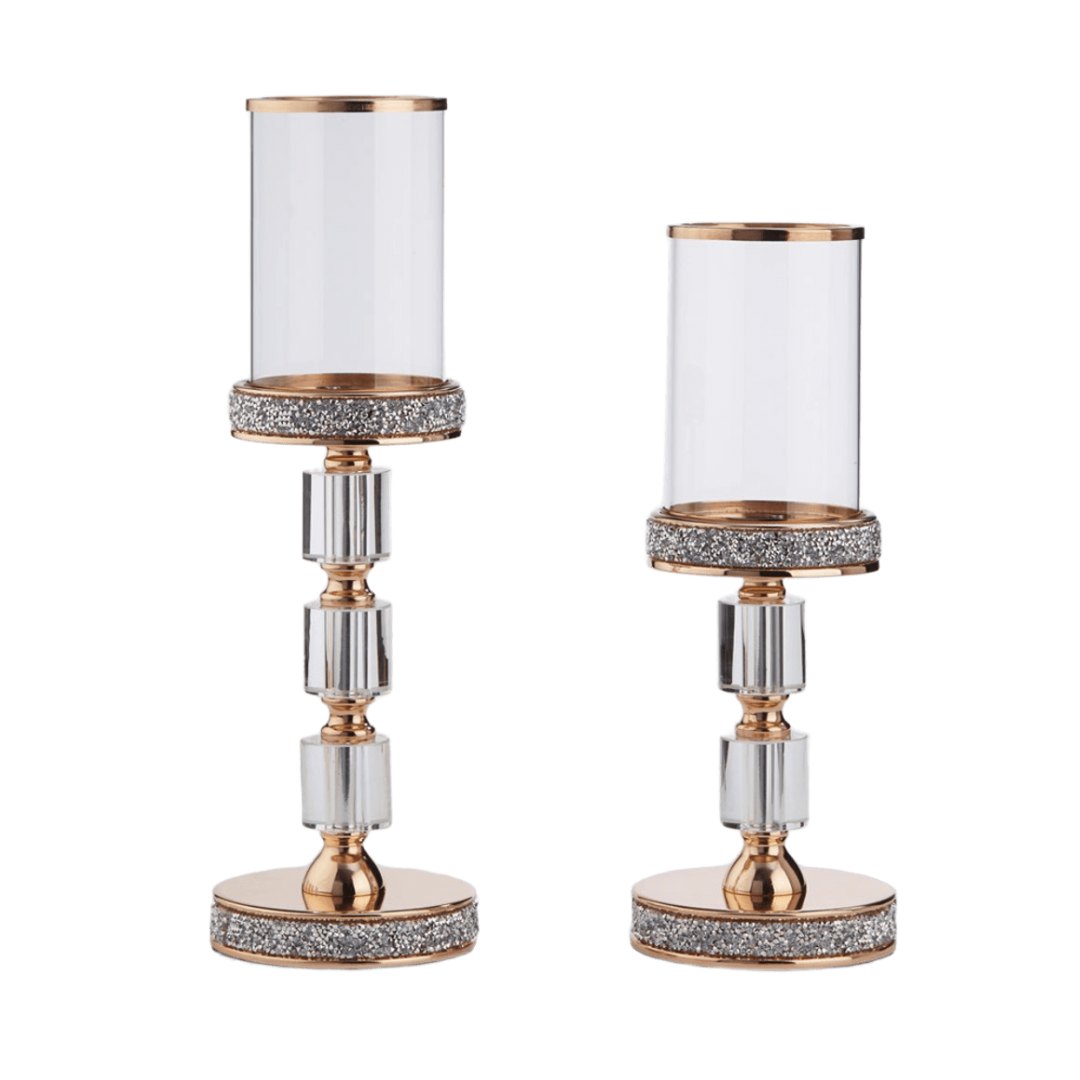 Κηροπήγια σετ κρυστάλλινα με χρυσή λεπτομέρεια και γυαλί στο επάνω μέρος, της εταιρίας Authentique Art, που μπορούν να χρησιμοποιηθούν ως λαμπάδες γάμου. Διαστάσεις 38×12 cm και 31.5×12 cm.