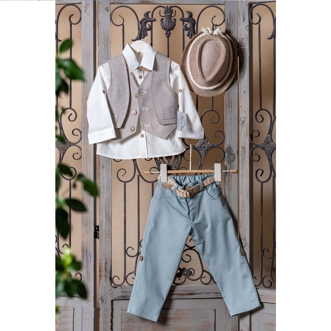 Βαμβακερό κοστούμι βάπτισης με παντελόνι με κουμπάκι στο πλάι και θηλιά ώστε να γίνεται σορτσάκι