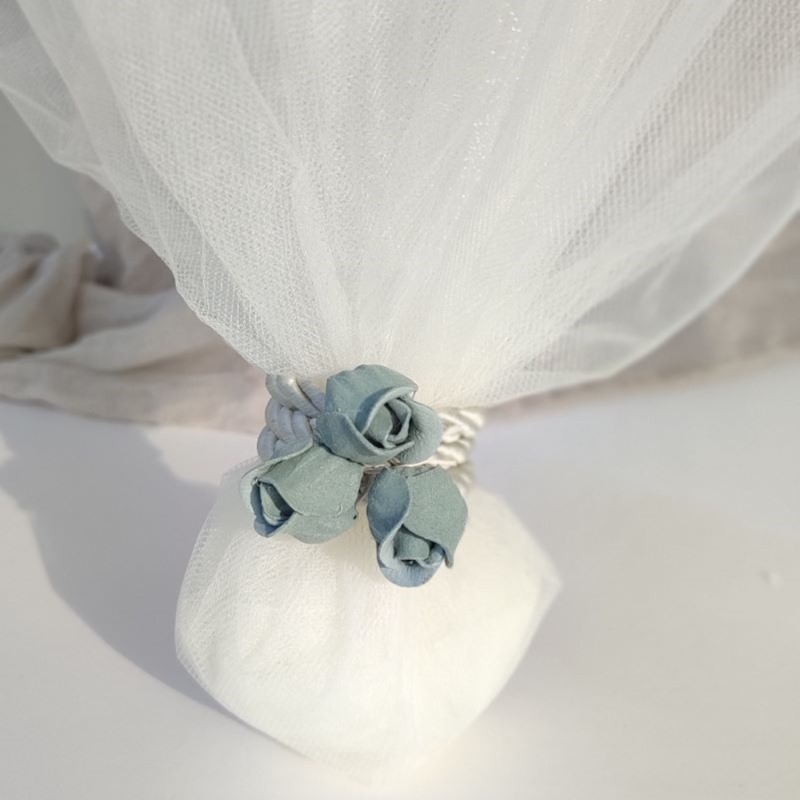 Μπομπονιέρα γάμου από τούλι διαστάσεων 40×40 εκ, δεμένη με στριφτό σατέν κορδόνι και τρία λουλούδια.