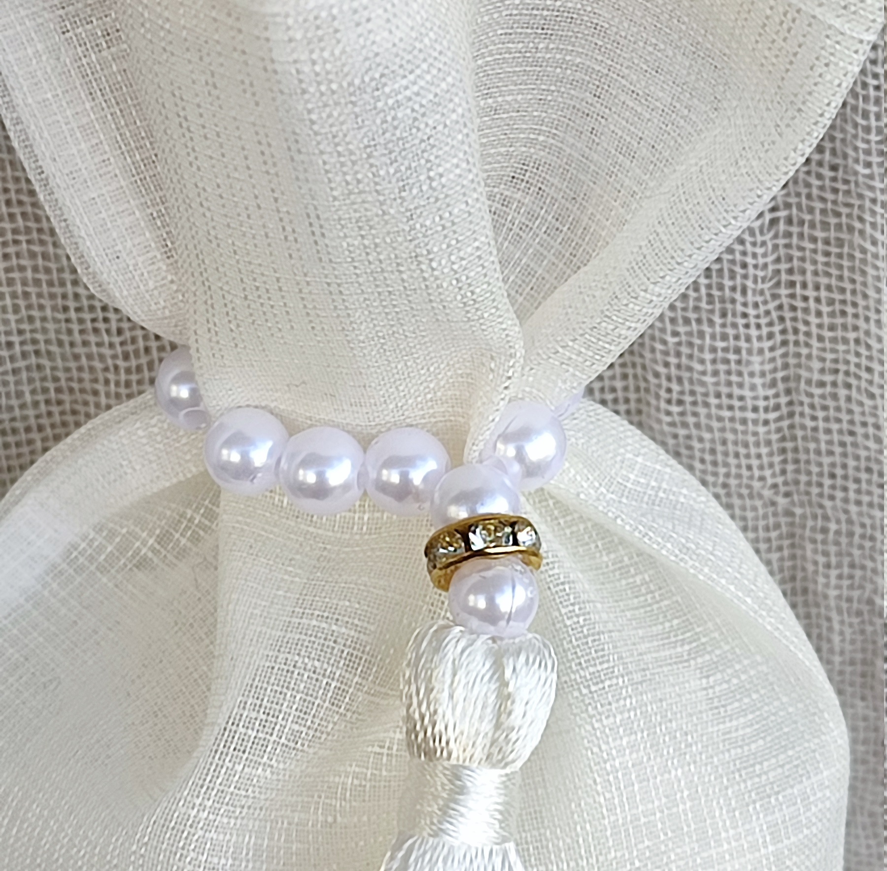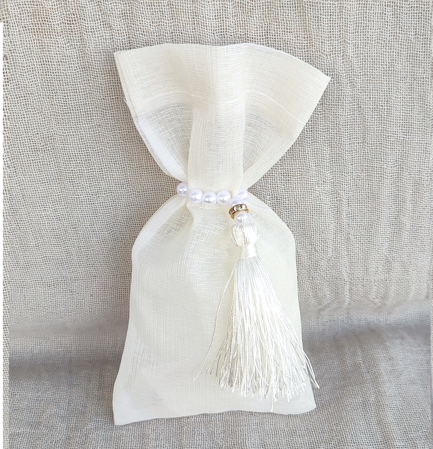 Οικονομική μπομπονιέρα γάμου πουγκί δεμένο με λευκή φούντα και πέρλες.
