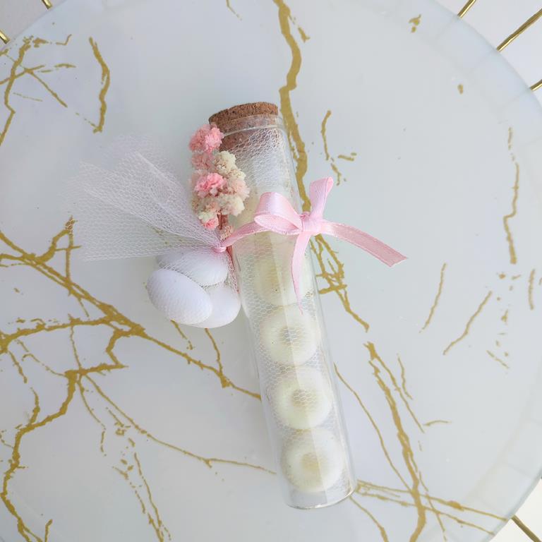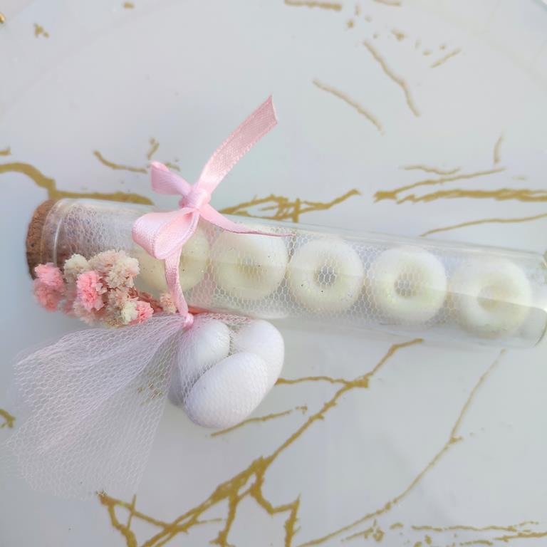 Μπομπονιέρα γυάλινος σωλήνας με 5 wax melts σε σχήμα ντόνατ, σε χρώμα και άρωμα της επιλογής σας.