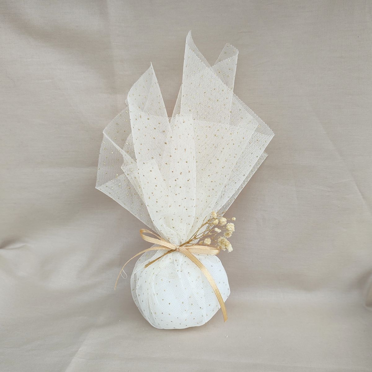 Οικονομική μπομπονιέρα γάμου από τούλι με γκλιτερ διαστάσεων 36×36 εκ, δεμένη με σατέν κορδέλα και αποξηραμένη γυψοφύλλη.