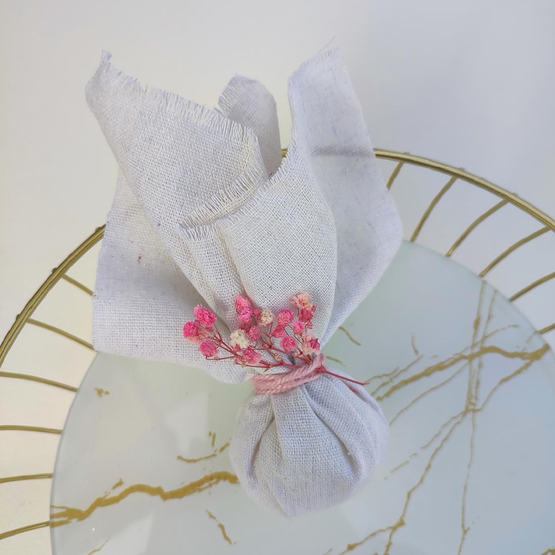Οικονομική μπομπονιέρα γάμου λινό μαντήλι διαστάσεων 30×30 εκ, δεμένη με κορδόνι και αποξηραμένο λουλουδάκι. Ιδανική επιλογή για γάμο ή/και βάπτιση.