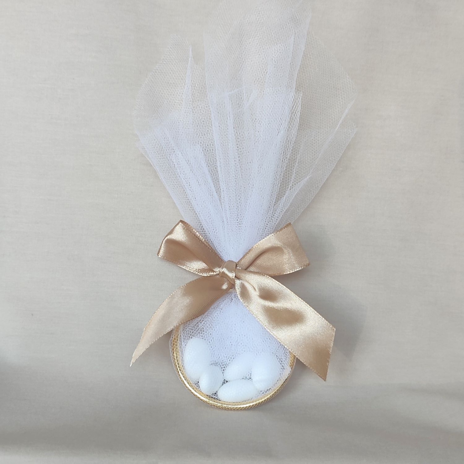 Οικονομική μπομπονιέρα γάμου με κρίκο 7 εκ., μέσα σε τούλι και δεμένο με σατέν χρυσή κορδέλα.
