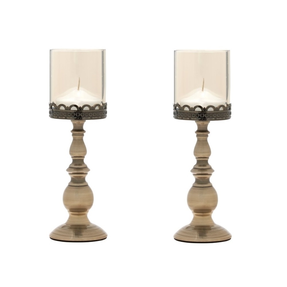 Κηροπήγια σετ κρυστάλλινα με ασημένια λεπτομέρεια και με γυαλί στο επάνω μέρος, της εταιρίας Authentique Art, που μπορούν να χρησιμοποιηθούν ως λαμπάδες γάμου. Διαστάσεις 38×12 cm και 31.5×12 cm.