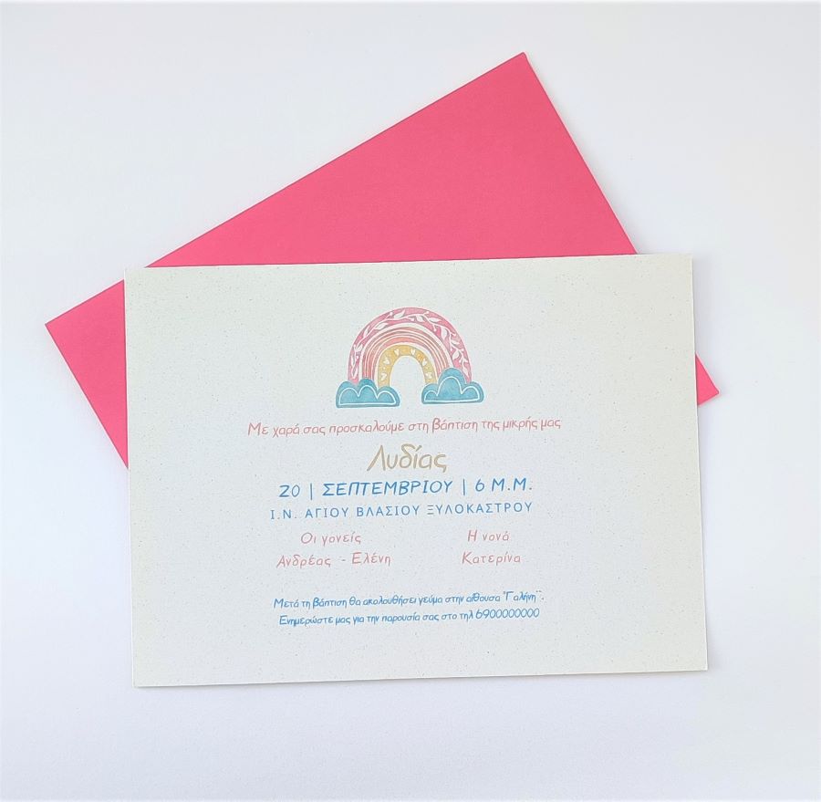 Προσκλητήριο βάπτισης με θέμα ουράνιο τόξο, διαστάσεων 12 cm x 18 cm, τυπωμένο σε χαρτονάκι ακουαρέλα 240γρ.