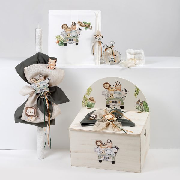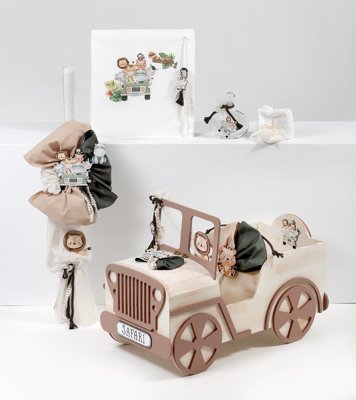 Ολοκληρωμένο πακέτο βάπτισης με θέμα Σαφάρι με ξύλινο όχημα