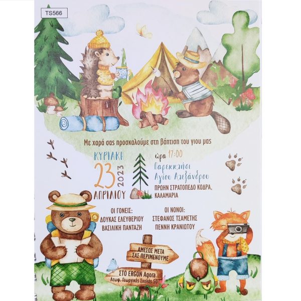 Προσκλητήριο βάπτισης για αγόρι με θέμα ζωάκια σε κάμπινγκ, σε χαρτί Bristol Λευκό 250gr σε διάσταση 19,5×14,5 cm.