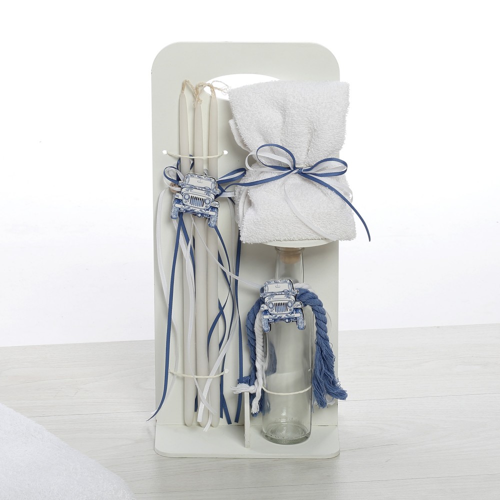 Λαμπάδα: Στολισμένη με μεγάλο μπλε υφασμάτινο φιόγκο, χοντρά σχοινιά σε λευκό και μπλε, και ένα μεγάλο ξύλινο διακοσμητικό που απεικονίζει το vintage Jeep της συλλογής.