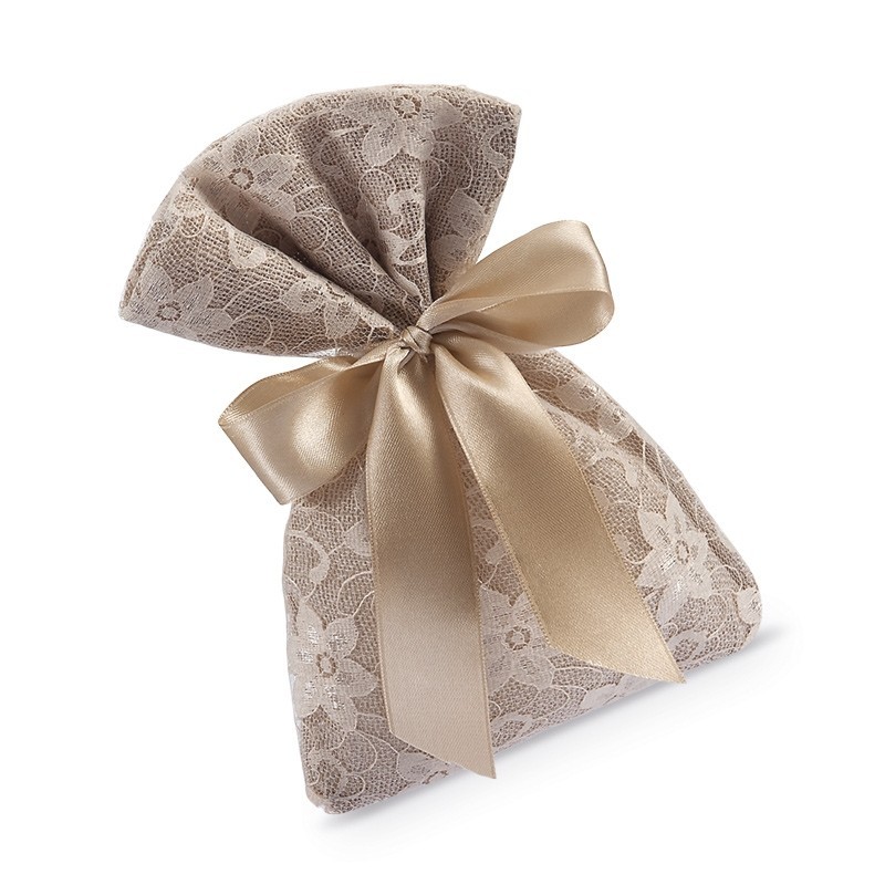 Πουγκί λινό natural με δαντέλα καφέ, διαστάσεων 14 x 20 cm, δεμένο με κορδέλα σατέν διπλής όψης 1,5 cm