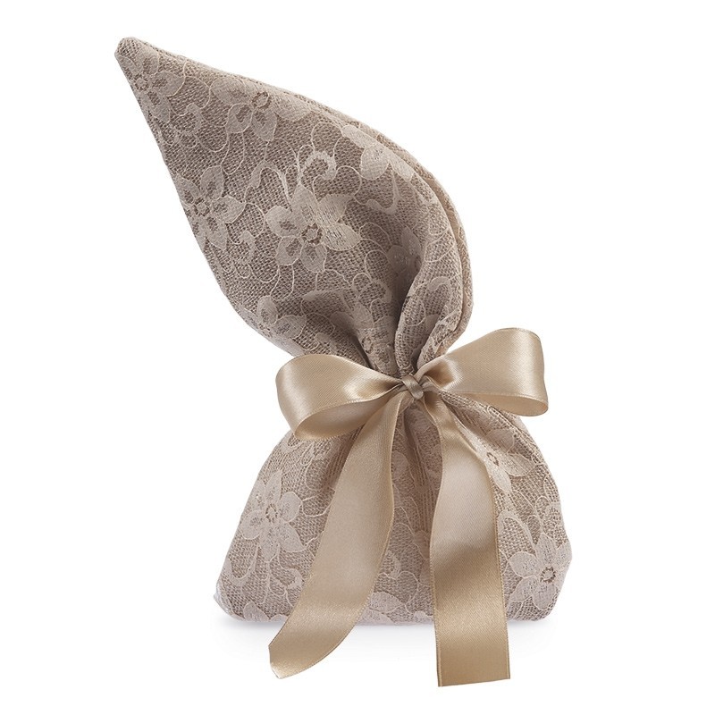 Πουγκί λινό natural με δαντέλα σάπιο μήλο, διαστάσεων 14 x 20 cm δεμένο με κορδέλα σατέν διπλής όψης 1,5 cm