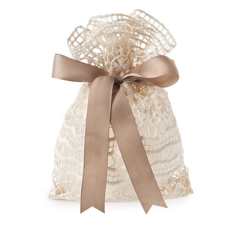Πουγκί 14x18cm από ισπανική δαντέλα σε μπεζ απόχρωση δεμένο με γκρο κορδέλα 2 cm