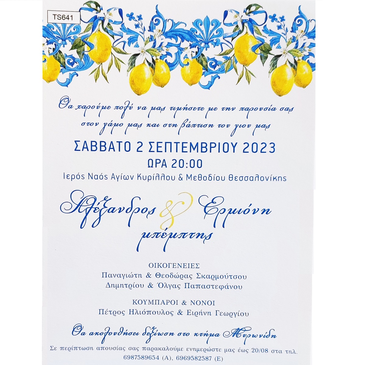 Προσκλητήριο γάμου & βάπτισης με λεμόνια και μπλε ρουά χρωματισμούς εμπνευσμένο από τα μαγιόλικα ιταλικά κεραμικά, σε χαρτί Old Mill Premium White 250gr σε διάσταση 19,5×14,5 cm.