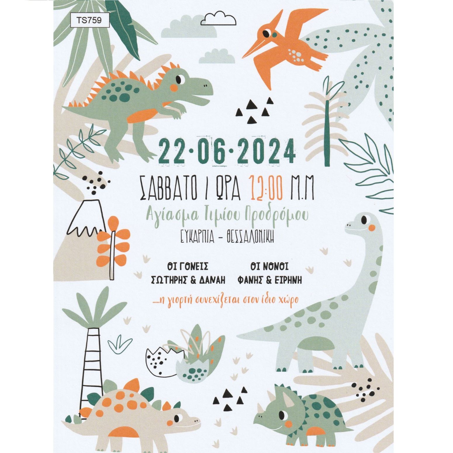 Προσκλητήριο βάπτισης για αγόρι με θέμα Δεινόσαυροι, σε χαρτί Bristol Λευκό 250gr σε διάσταση 19,5×14,5 cm.
