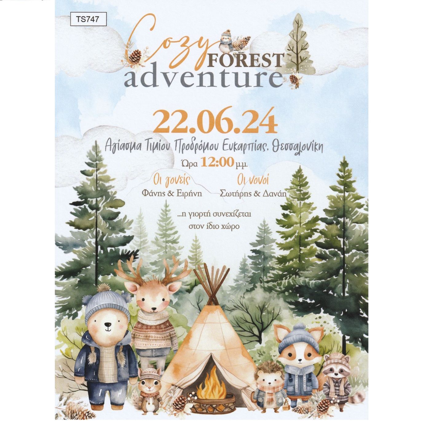 Προσκλητήριο βάπτισης για αγόρι με θέμα Forest adventure, σε χαρτί Bristol Λευκό 250gr σε διάσταση 19,5×14,5 cm.