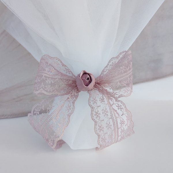 Μπομπονιέρα γάμου από τούλι διαστάσεων 40x40 εκ, δεμένη με φαρδιά κορδέλα δαντέλα και λουλούδι σε χρώμα σάπιο μήλο.