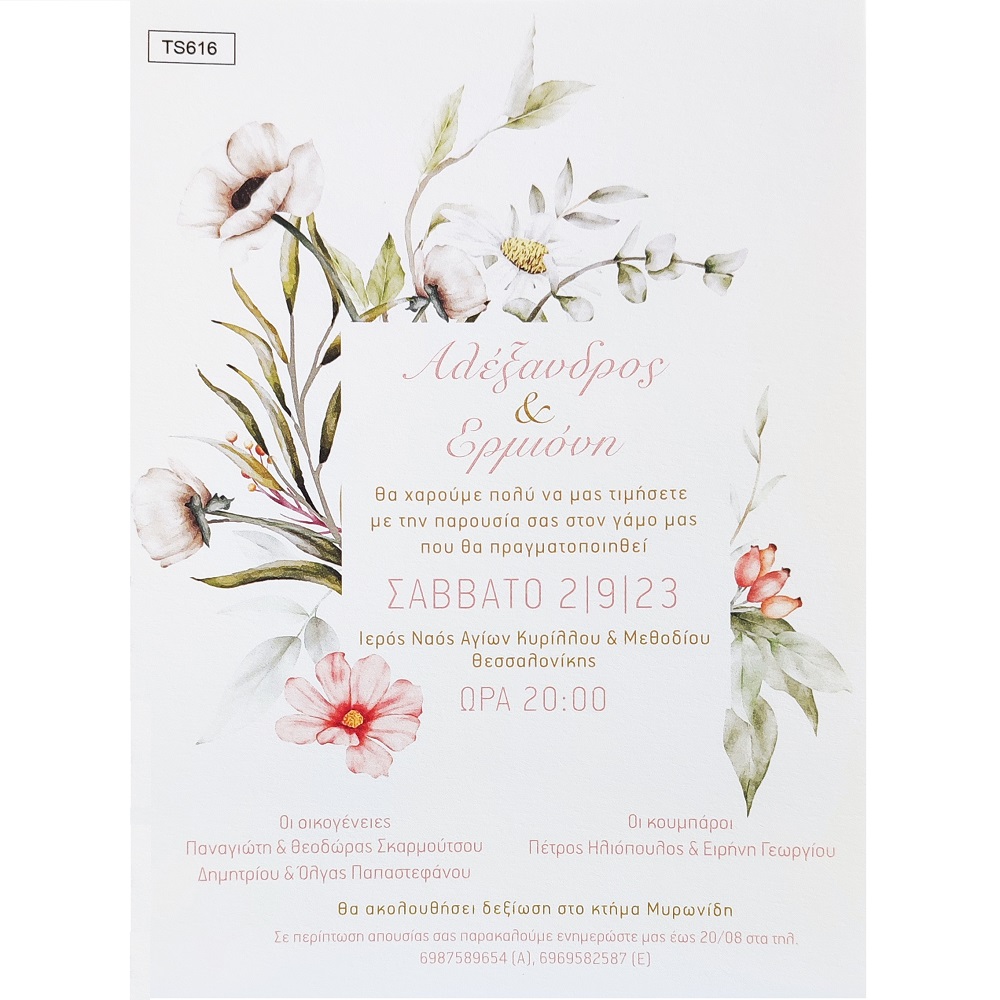 Προσκλητήριο γάμου αγριολούλουδα, σε χαρτί Old Mill Premium White 250gr σε διάσταση 19,5×14,5 cm.