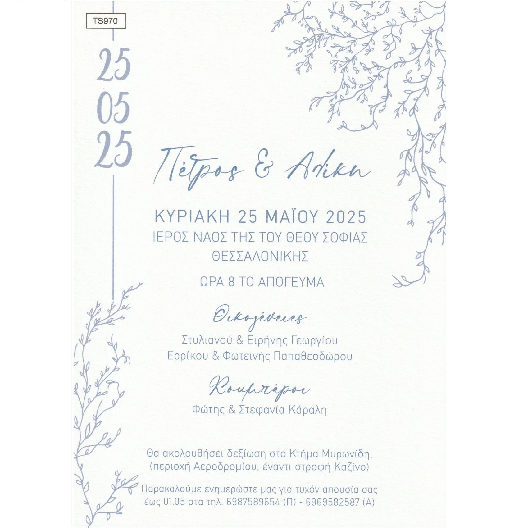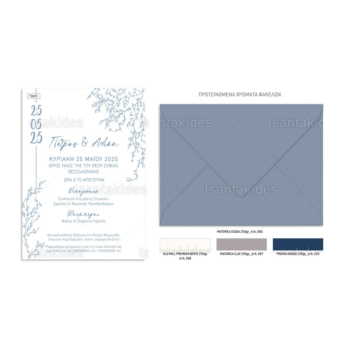Προσκλητήριο γάμου μπλε λουλούδια, σε χαρτί Old Mill Premium White 250gr σε διάσταση 19,5×14,5 cm.