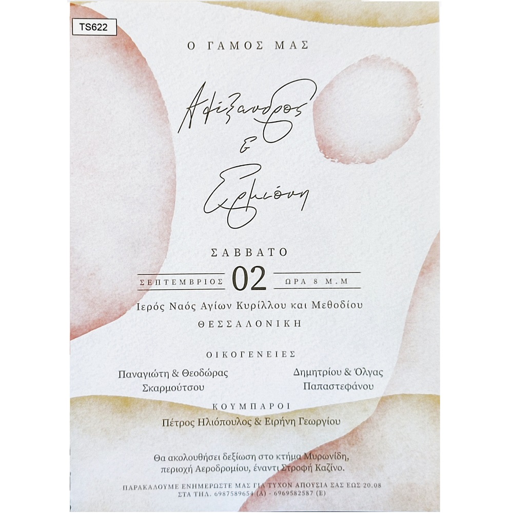 Προσκλητήριο γάμου σε abstract ύφος με nude χρωματισμούς, σε χαρτί Old Mill Premium White 250gr σε διάσταση 19,5×14,5 cm.