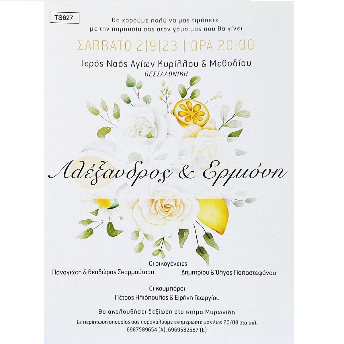 Προσκλητήριο γάμου με floral σύνθεση με τριαντάφυλλα και λεμόνια, σε χαρτί Old Mill Premium White 250gr σε διάσταση 19,5×14,5 cm.