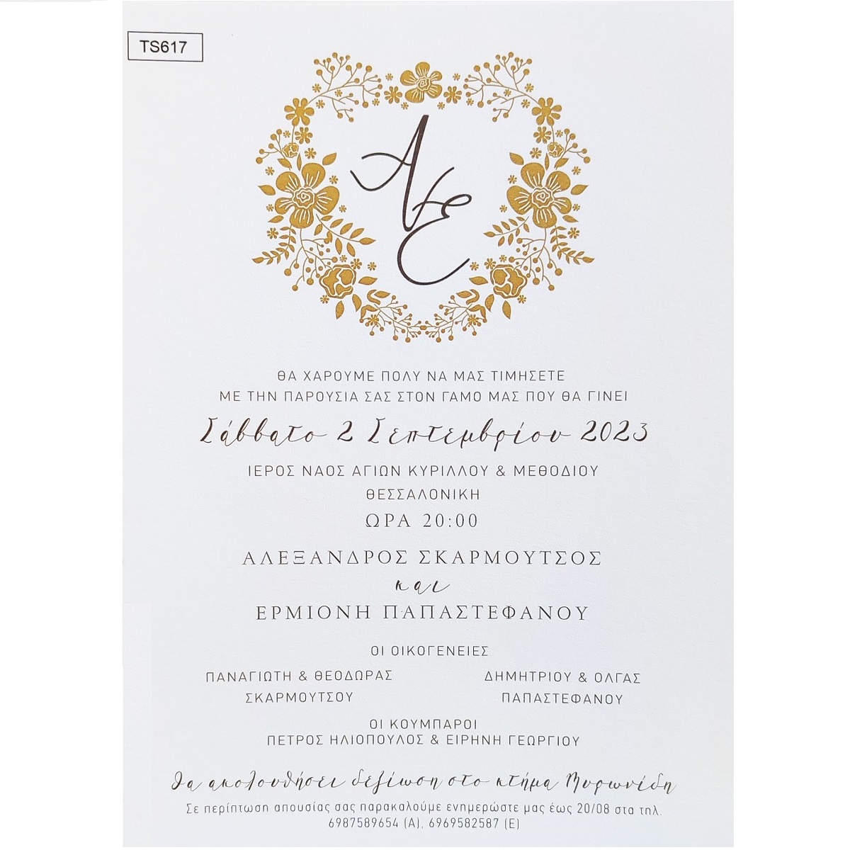 Προσκλητήριο γάμου με μονογράμματα και floral χρυσό στεφάνι, σε χαρτί Old Mill Premium White 250gr σε διάσταση 19,5×14,5 cm.