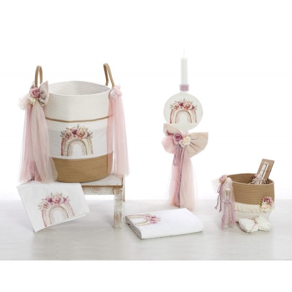 Ολοκληρωμένο βαπτιστικό σετ με θέμα το Ουράνιο Τόξο, διακοσμημένο με υψηλής ποιότητας UV εκτύπωση και ρομαντικά στοιχεία σε παστέλ αποχρώσεις του ροζ και του μπεζ. Ιδανικό για μια παραμυθένια και κομψή βάπτιση. Το σετ περιλαμβάνει: