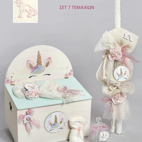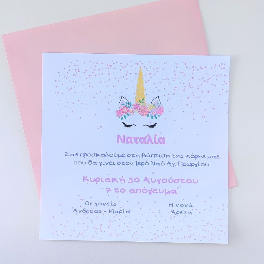 Προσκλητήριο βάπτισης με θέμα μονόκερος, διαστάσεων 16 cm x 16 cm, τυπωμένο σε χαρτονάκι ακουαρέλας 240γρ.
