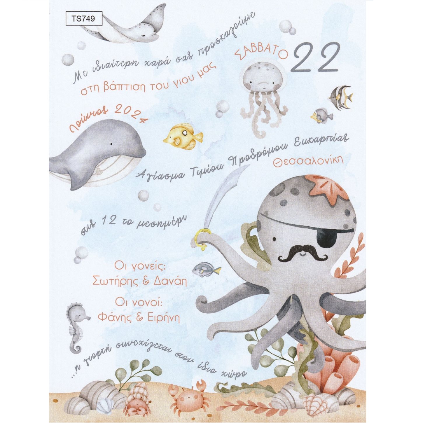 Προσκλητήριο βάπτισης για αγόρι με θέμα Βυθός, σε χαρτί Bristol Λευκό 250gr σε διάσταση 19,5×14,5 cm.