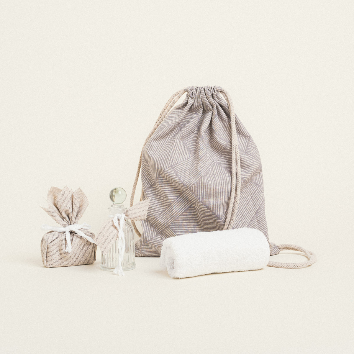 Μπομπονιέρα πουγκί οβάλ με κορδόνι, διαστάσεων 13 x 14 cm, συνδυασμένο με το σετ βάπτισης διαγώνιες γραμμές μπεζ.