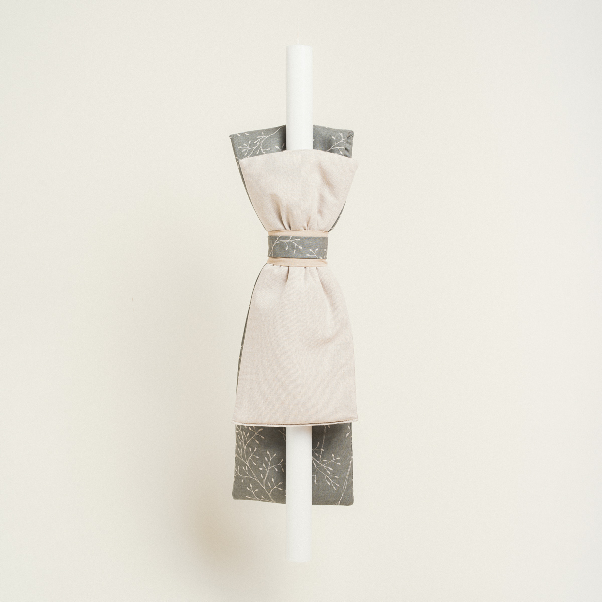 Μπομπονιέρα πουγκί με βάση, διαστάσεων 8 x 12 cm, συνδυασμένο με το σετ βάπτισης κλαδιά σε λαδί φόντο.