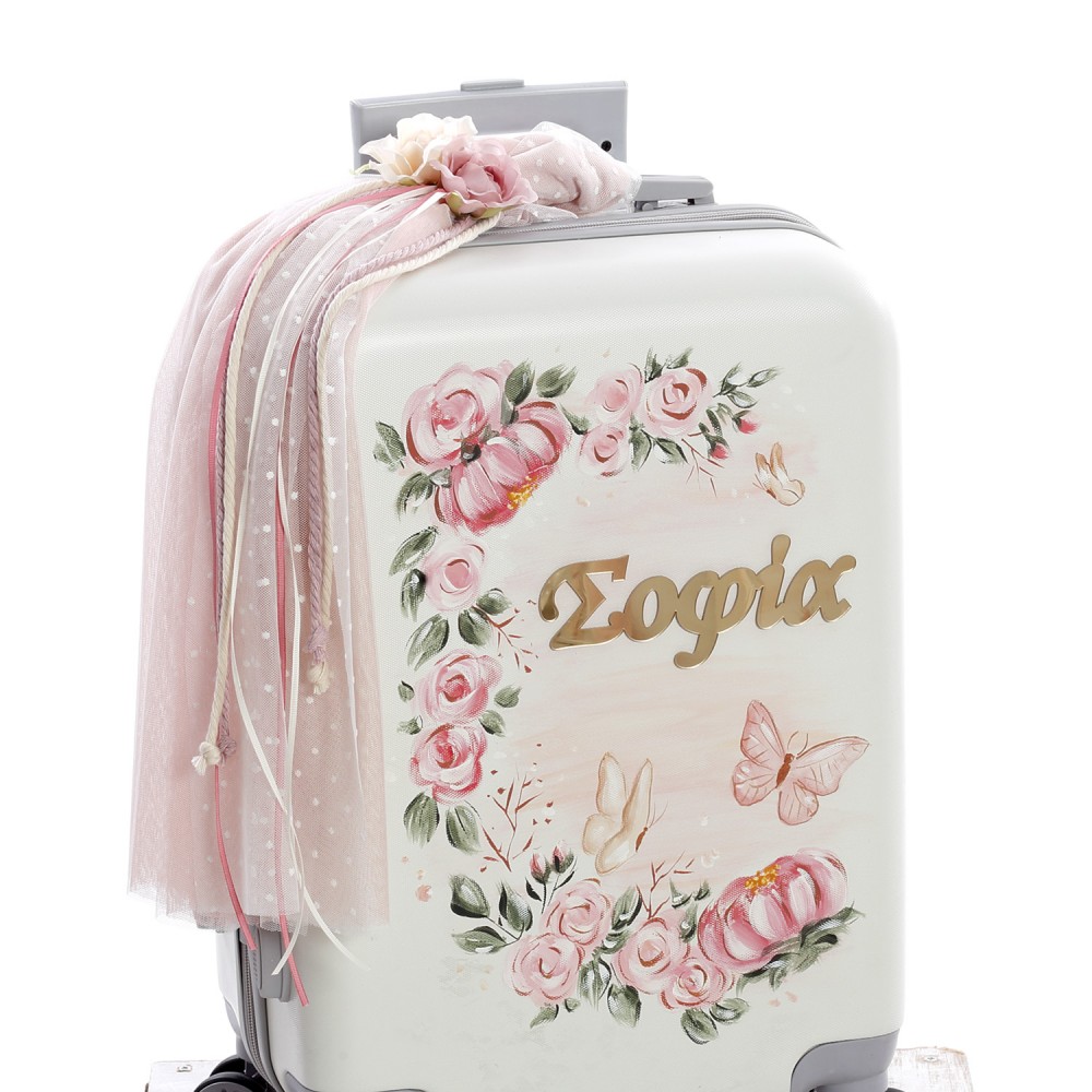 ✔ Βαλίτσα τροχήλατη ζωγραφισμένη στο χέρι, με πανέμορφα τριαντάφυλλα, πεταλούδες και χρυσό plexiglass μονόγραμμα. Στολισμένη με τούλια, κορδέλες και υφασμάτινα λουλούδια. (Διαστάσεις: 57cm x 40cm x 22cm)