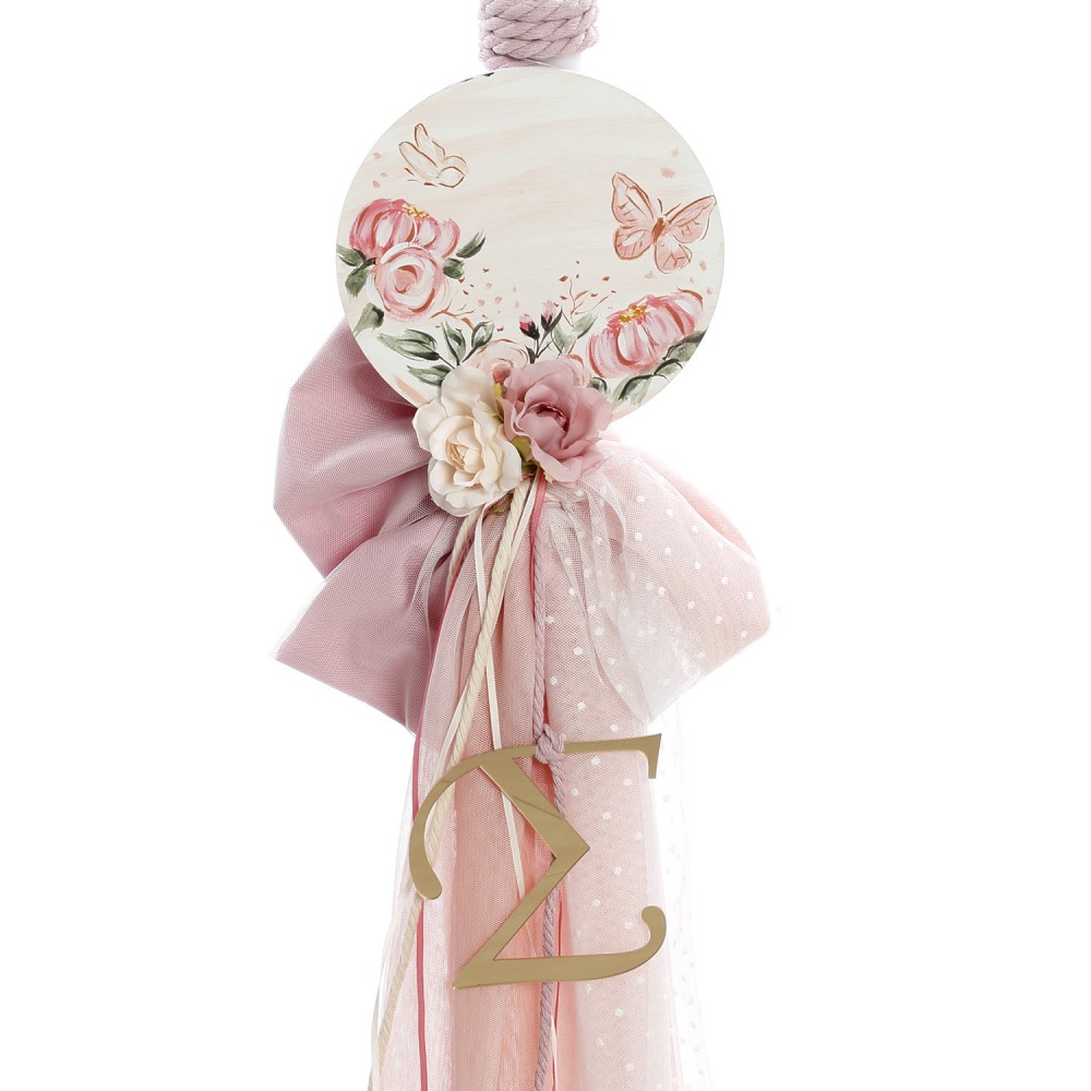 ✔ Λαμπάδα βάπτισης, διακοσμημένη με ξύλινο στοιχείο UV εκτύπωσης λουλουδιών, πολυτελείς φιόγκους, τούλι και χρυσό μονόγραμμα.