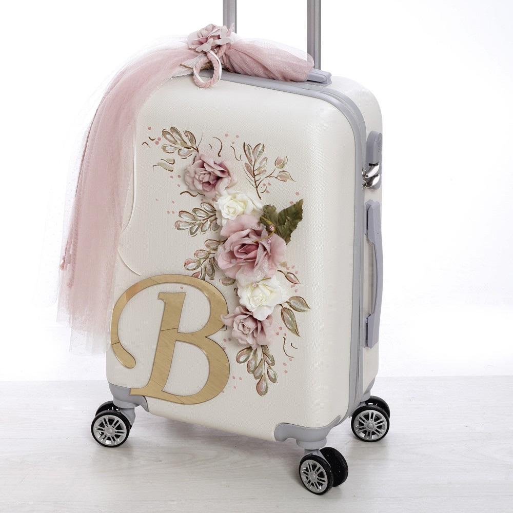 Σετ βάπτισης με θέμα λουλούδια μονόγραμμα, με βαλίτσα ζωγραφισμένη στο χέρι.