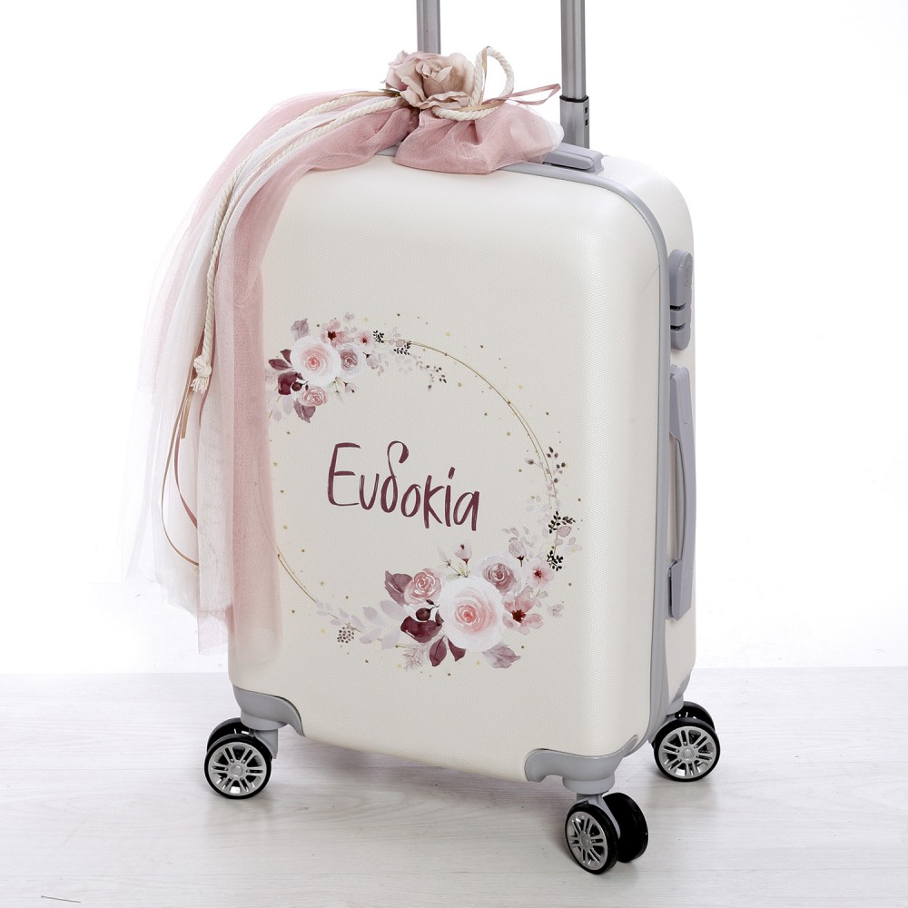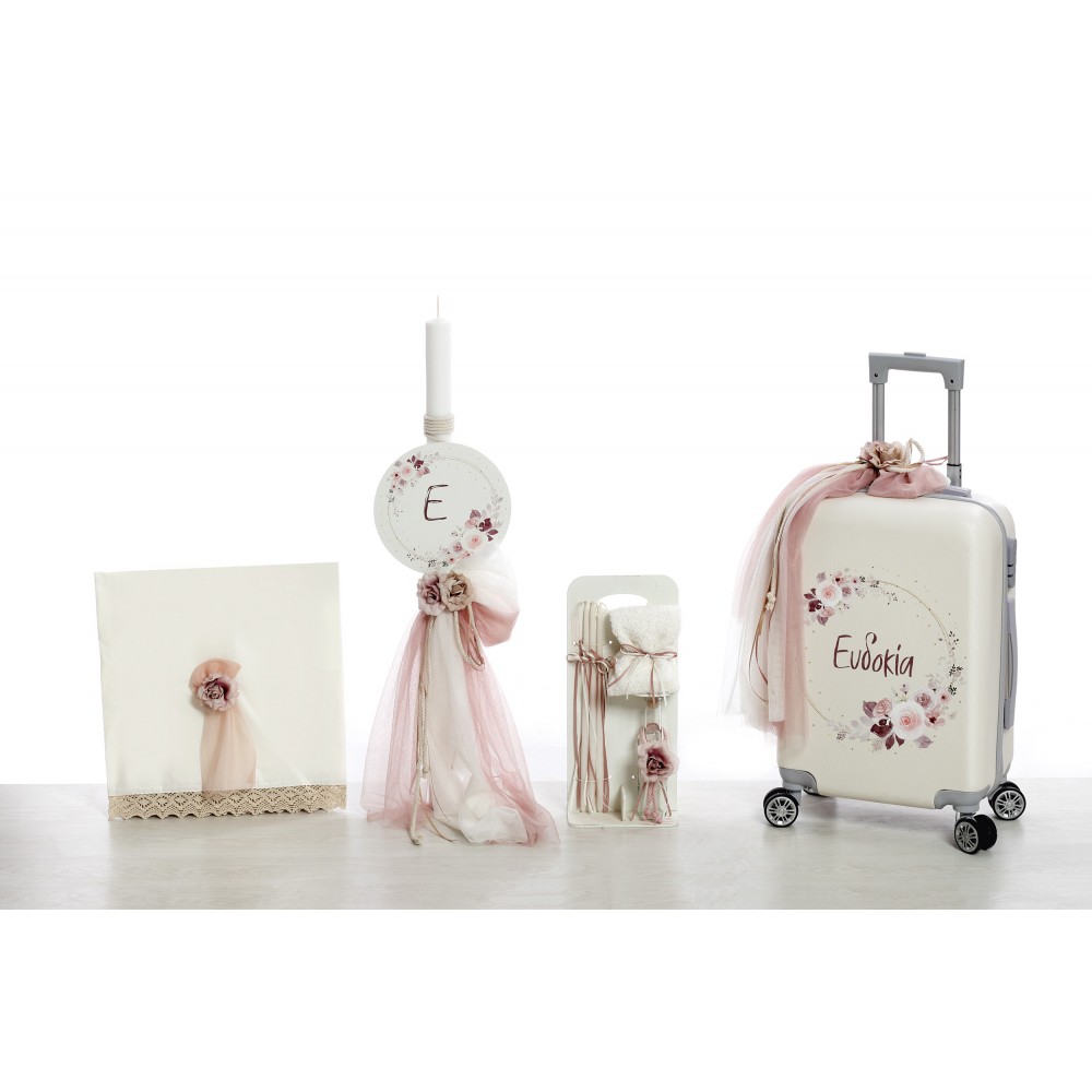 Σετ βάπτισης 5τμχ με θέμα Λουλούδια και Όνομα σε εκτυπωμένη βαλίτσα