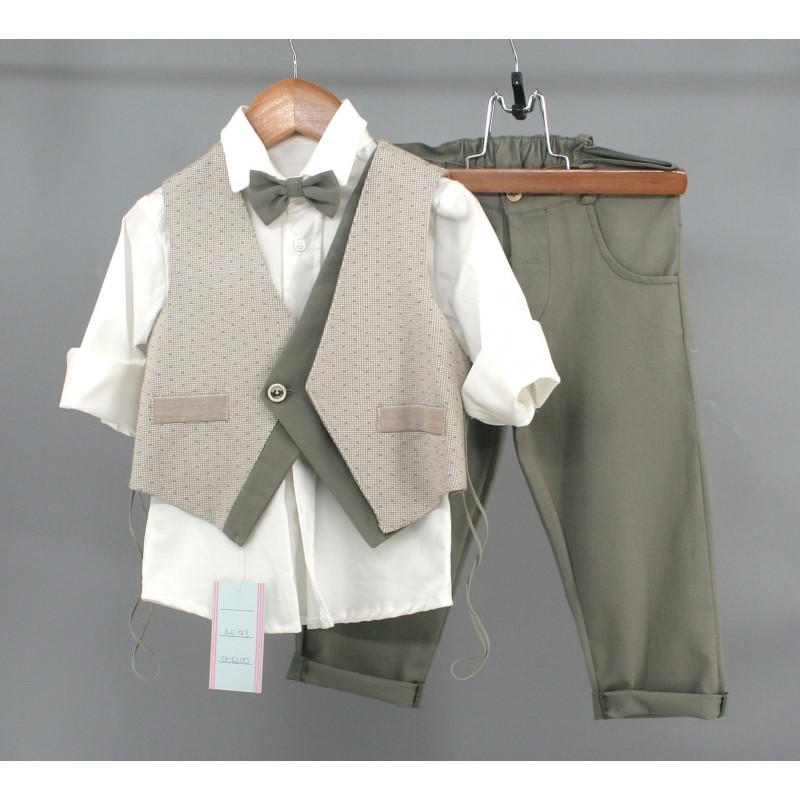 Βαπτιστικό ρούχο για αγόρι με μπεζ γιλέκο και χακί παντελόνι. της εταιρίας MAKBABY.