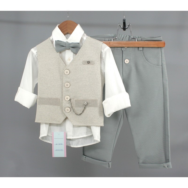 Βαπτιστικό ρούχο για αγόρι με μπέζ-γκρι γιλέκο και γκρι παντελόνι της εταιρίας MAKBABY.