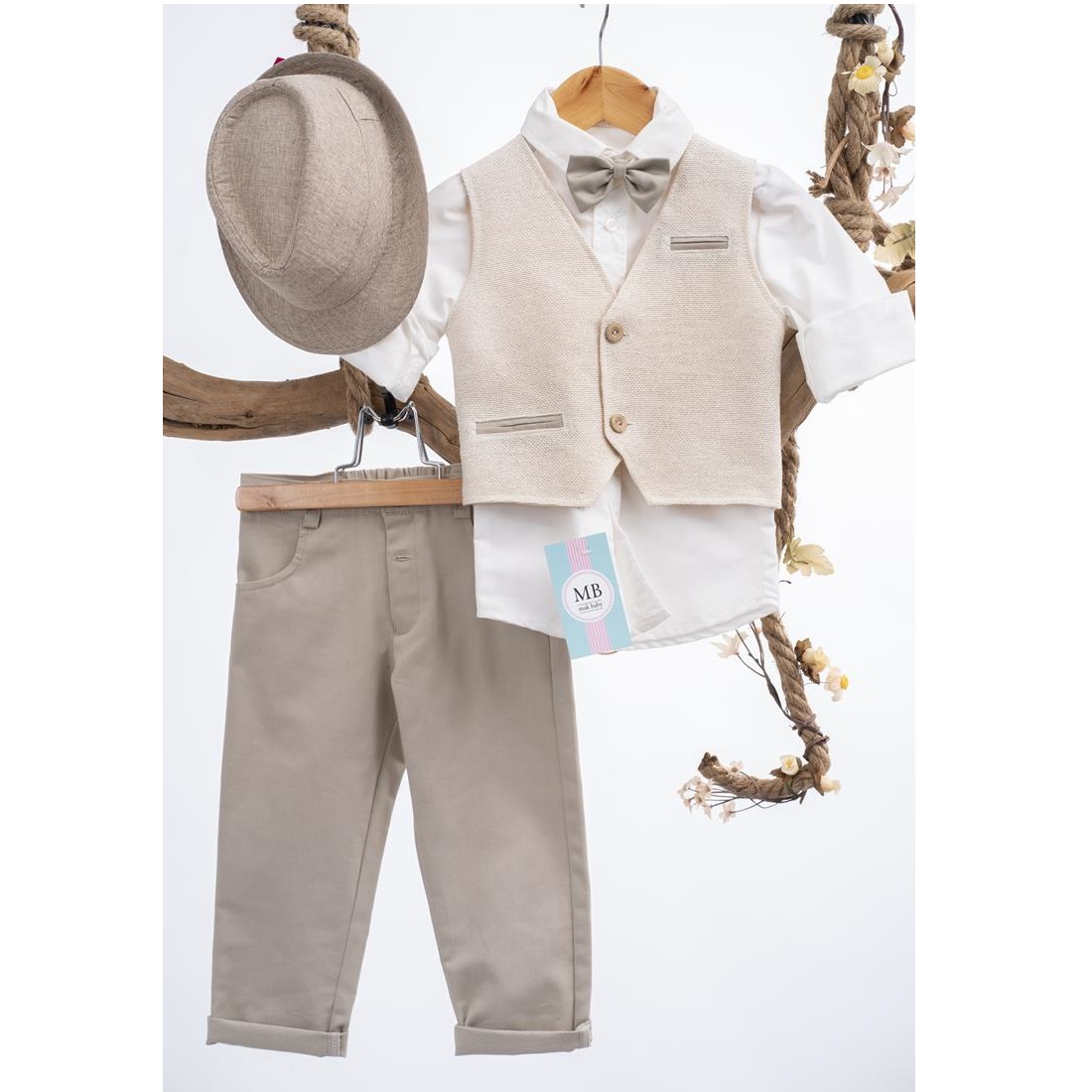 Το σετ περιλαμβάνει: Πουκάμισο, γιλέκο, παντελόνι, παπιγιόν και καπελάκι.