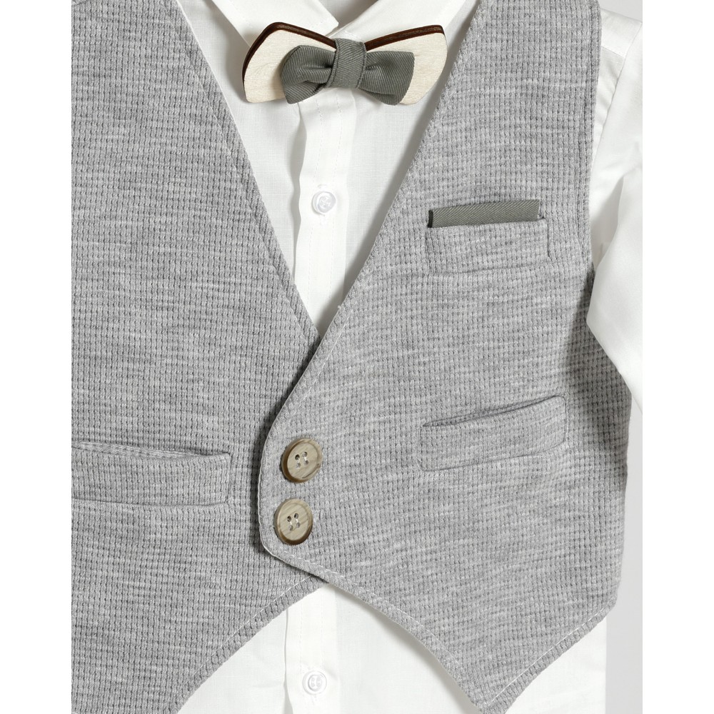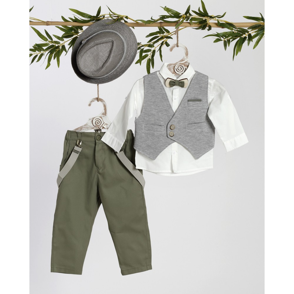 Το σετ περιλαμβάνει: Πουκάμισο, γιλέκο, παντελόνι, παπιγιόν και καπελάκι.