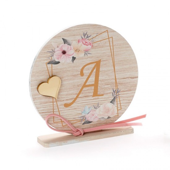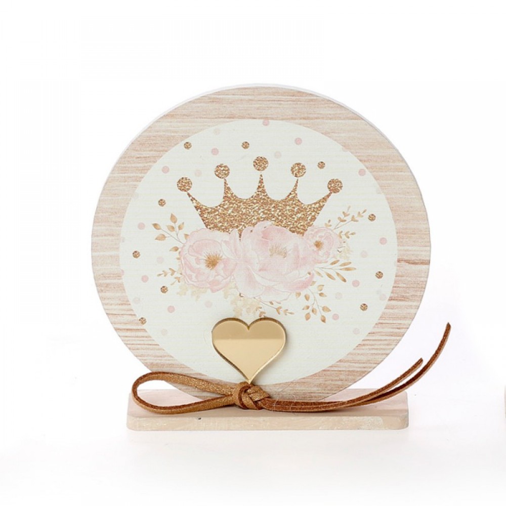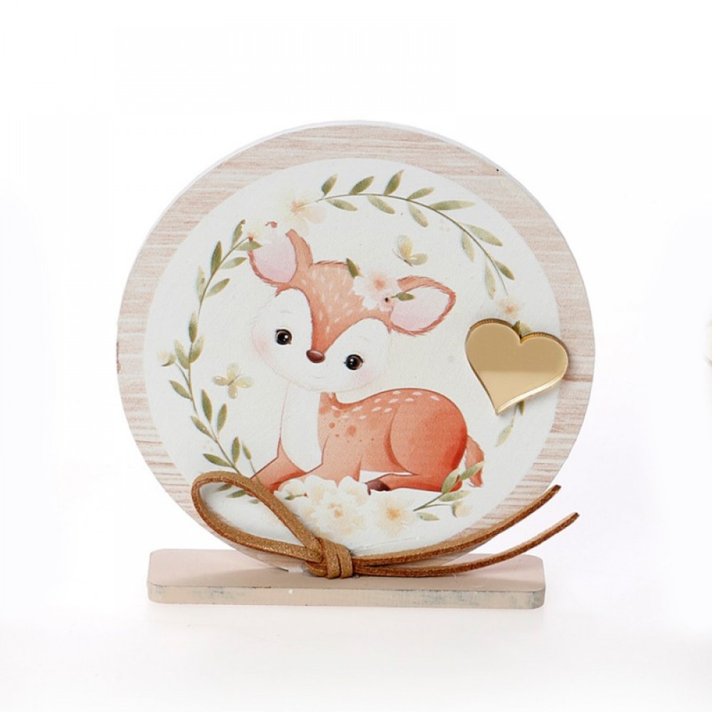 Μπομπονιέρα βάπτισης ξύλινο στρογγυλό καδράκι πάνω σε βάση, σε διάφορα θέματα.